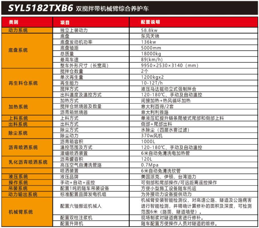 SYL5182TXB6 雙攪拌帶機(jī)械臂路面綜合養(yǎng)護(hù)車是一款集現(xiàn)場生產(chǎn)新瀝青混合料、瀝青路面冷料、舊料、銑刨料 100%現(xiàn)場加熱再生利用 ,熱瀝青灑布、裂紋跟蹤灌縫、乳化 瀝青噴灑、為其他裝置提供電力和液壓動力等多種功能于一體的瀝青路面熱再生綜合養(yǎng)護(hù)車。配置智能隧道檢測設(shè)備 ,一車多能 ,完成對公路、隧道病害? (坑槽、裂紋等)? 進(jìn)行智能檢測和快速修補(bǔ)??蓪?shí)現(xiàn)多場合、多路面的各種類養(yǎng)護(hù)作業(yè)。養(yǎng)護(hù)修補(bǔ)費(fèi)用低 ,作業(yè)快捷 ,高效率、節(jié)能環(huán)保性能突出等特點(diǎn)。適用于多種路況的中大施工量和高速公路中的隧道的檢測和修補(bǔ)施工。