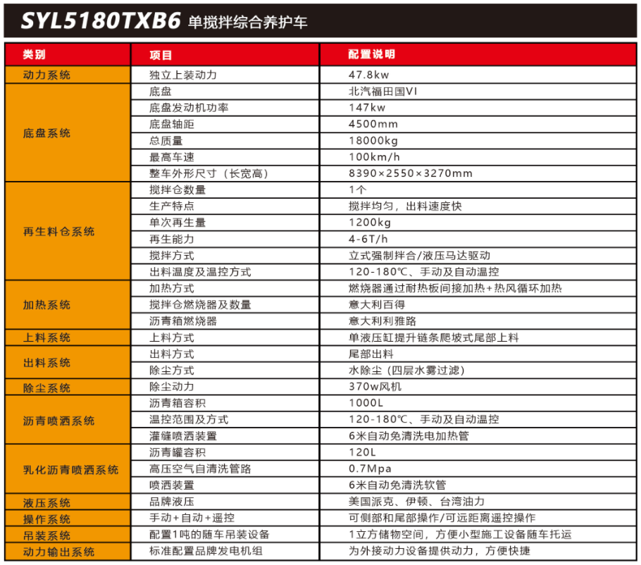 SYL5180TXB6 單攪拌綜合養(yǎng)護車是一款集現(xiàn)場生產(chǎn)新瀝青混合料、瀝青路面冷料、 舊料、銑刨料 100%現(xiàn)場加熱再生利用 ,熱瀝青灑布、裂紋跟蹤灌縫、乳化瀝青噴灑、為 其他裝置提供電力和液壓動力等多種功能于一體的瀝青路面熱再生綜合養(yǎng)護車。可實現(xiàn)多 場合、多路面的各種類養(yǎng)護作業(yè) ,養(yǎng)護修補費用低 ,作業(yè)快捷 ,高效率、節(jié)能環(huán)保性能突 出等特點。適用于遠郊較寬闊區(qū)域中小施工量和高速公路的修補施工。