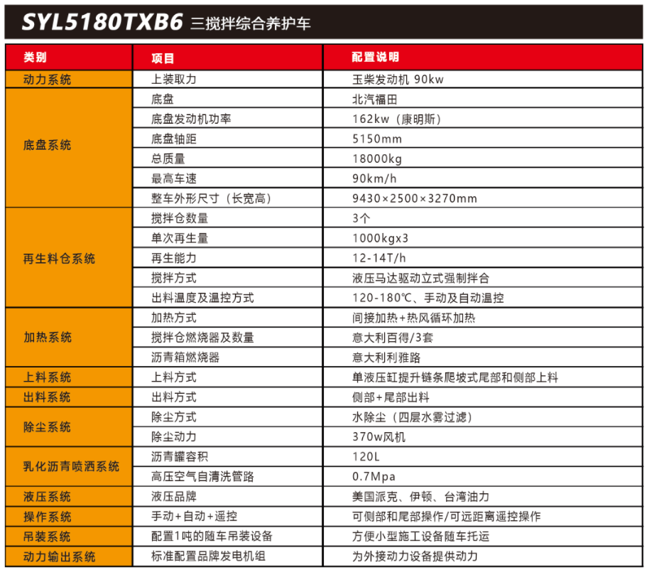 SYL5180TXB6 三攪拌路面綜合養(yǎng)護(hù)車是一款集現(xiàn)場生產(chǎn)新瀝青混合料、瀝青路面冷 料、舊料、銑刨料 100%現(xiàn)場加熱再生利用,熱瀝青灑布、裂紋跟蹤灌縫、乳化瀝青噴灑、 為其他裝置提供電力和液壓動(dòng)力等多種功能于一體的瀝青路面熱再生綜合養(yǎng)護(hù)車。可實(shí)現(xiàn)多場合、多路面的各種類養(yǎng)護(hù)作業(yè)。養(yǎng)護(hù)修補(bǔ)費(fèi)用低 ,作業(yè)快捷 ,高效率、節(jié)能環(huán)保性能