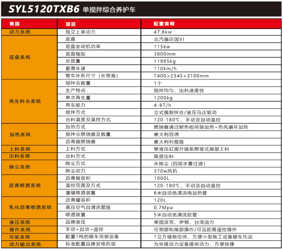 SYL5120TXB6單攪拌綜合養(yǎng)護車是一款集現(xiàn)場生產(chǎn)新瀝青混合料、瀝青路面冷料、舊料、銑刨料100%現(xiàn)場加熱再生利用 ,熱瀝青灑布、裂紋跟蹤灌縫、乳化瀝青噴灑、為其他裝置提供電力和液壓動力等多種功能于一體的瀝青路面熱再生綜合養(yǎng)護車??蓪崿F(xiàn)多場合、多路面的各種類養(yǎng)護作業(yè) ,養(yǎng)護修補費用低 ,作業(yè)快捷 ,高效率、節(jié)能環(huán)保性能突